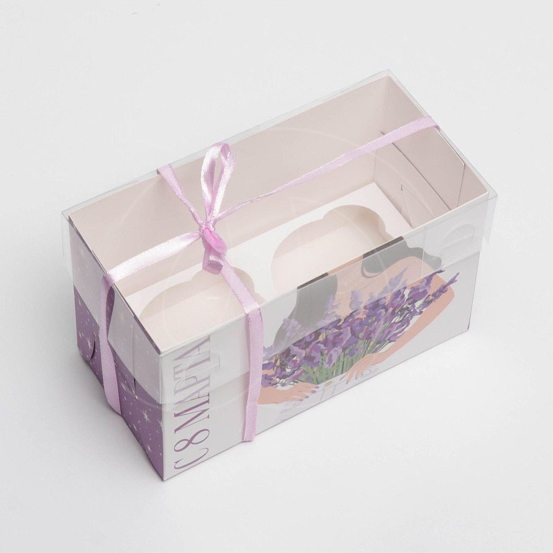 Доставка Коробка на 2 капкейка с окном "С 8 марта. Лаванда" 16х8х10 см из магазина в вашем городе: