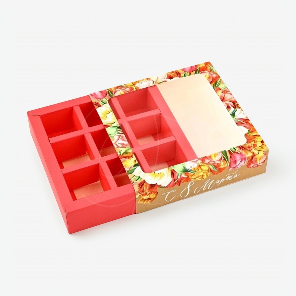 Коробка на 9 конфет с окном "С праздником весны" 14,5х14,5х3 см