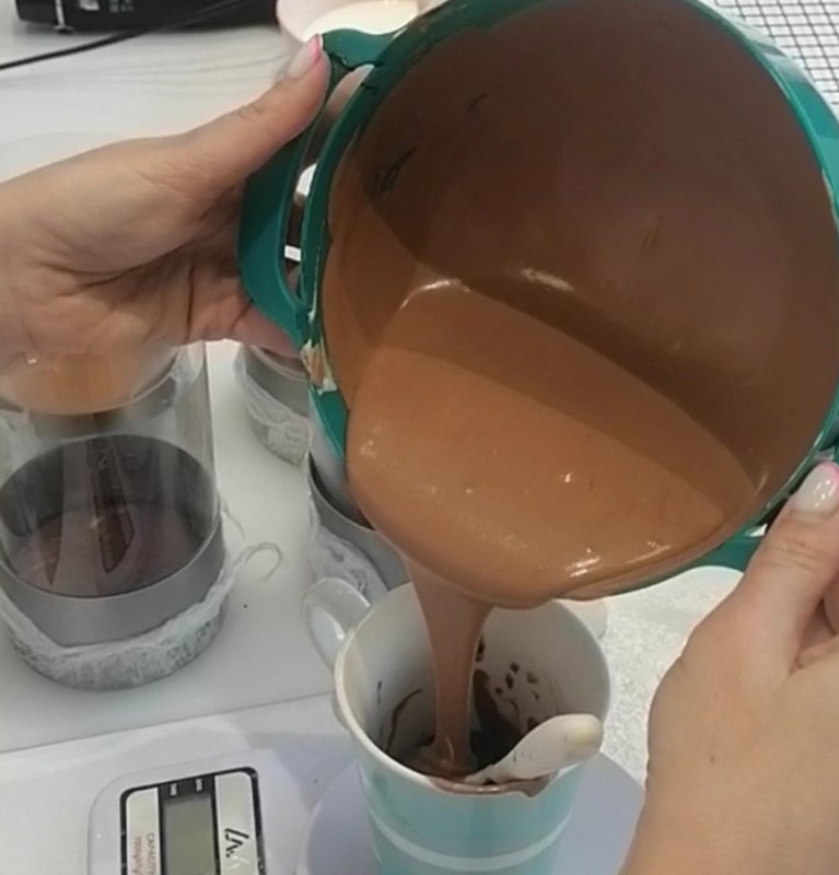 • влейте обратно остывший шоколад к 1/3 , проверьте температуру, она должна быть 31-32°.