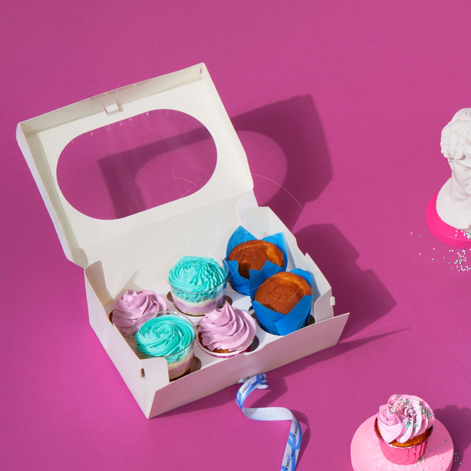 Коробка из плотного картона с панорамными окнами на крышке предназначена для упаковки капкейков.