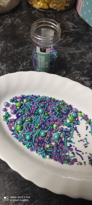 Очень красивая посыпка в сиреневых оттенках. Гармонично подобранные цвета. На тортике и капкейках смотрится очень красиво
