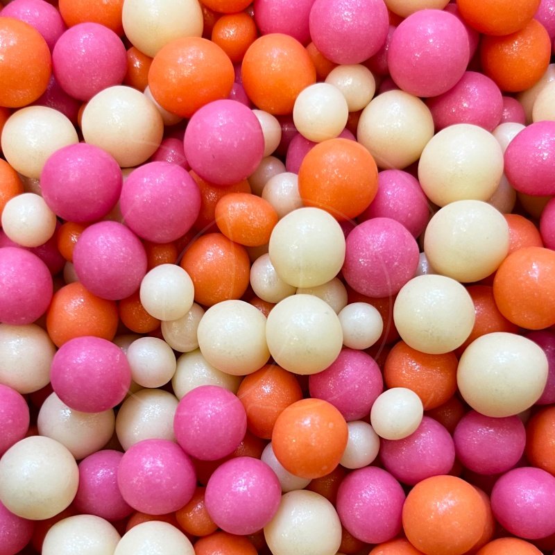 Жемчужная посыпка покрыта ярким пищевым блеском розового и белого цвета.