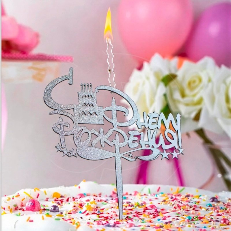 Доставка Свеча-топпер декоративная акриловая "С днём рождения" Серебро из магазина в вашем городе:
