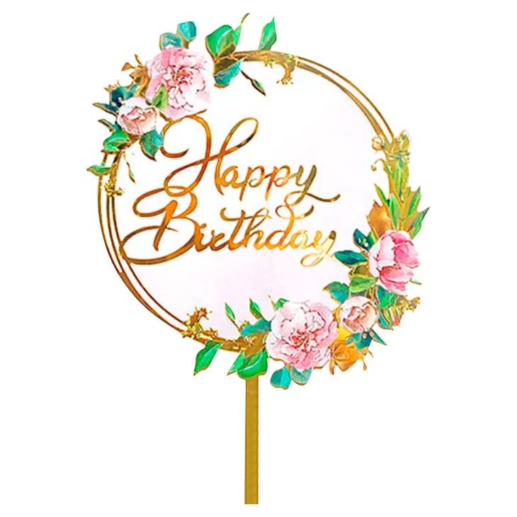 Доставка Топпер декоративный акриловый "Happy Birthday Розовые Цветы" Золотой из магазина в вашем городе:
